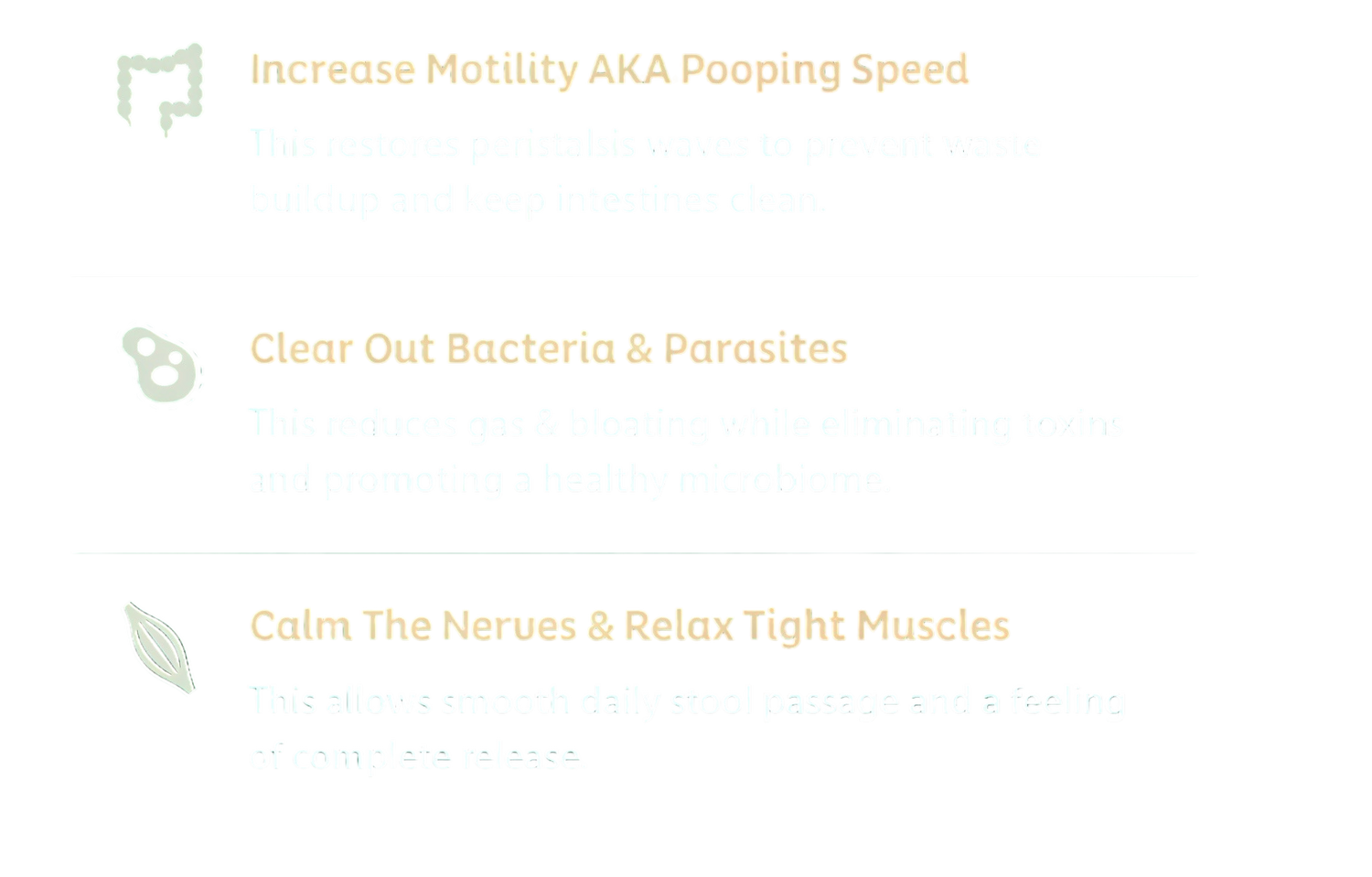 The best way to know what it does is to give it a try and find out how well it works for you. You're going to love how it calms down irritation, reduces bloating, reduces cravings, and honestly you're going to love how it makes you poop.